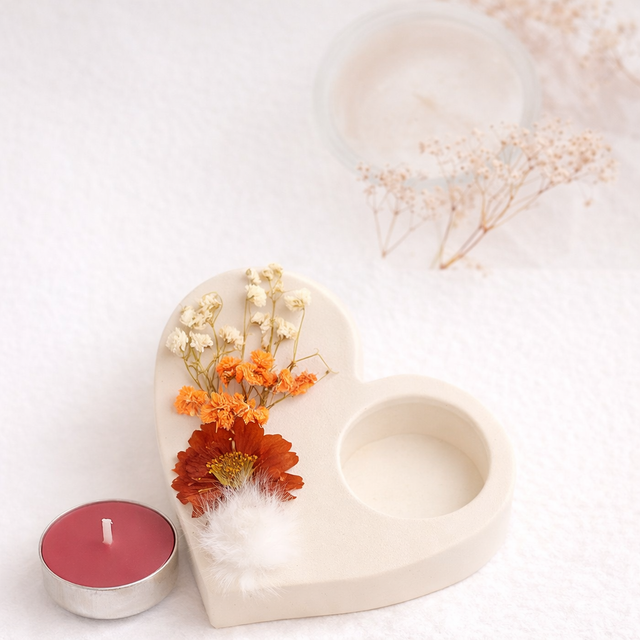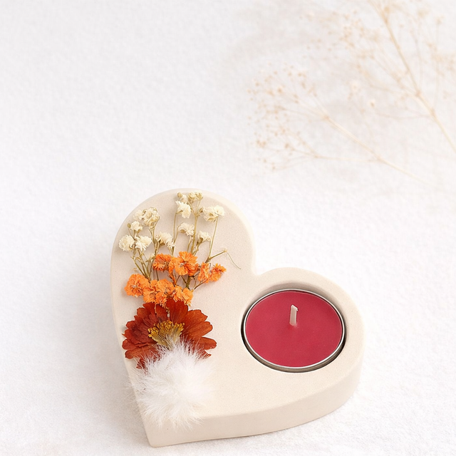 Bougeoir en Jesmonite avec Décoration Florale tons orange, pour bougie chauffe plat